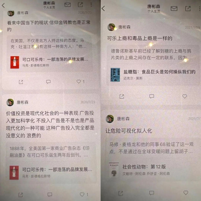 从时间线上来看,这两本书,他读于2020-2021年,不难看出,那时候,唐彬森对于可乐正产生了巨大的兴趣,当然也形成了很多批判性的思考,这也符合元气可乐的孕育轨迹。