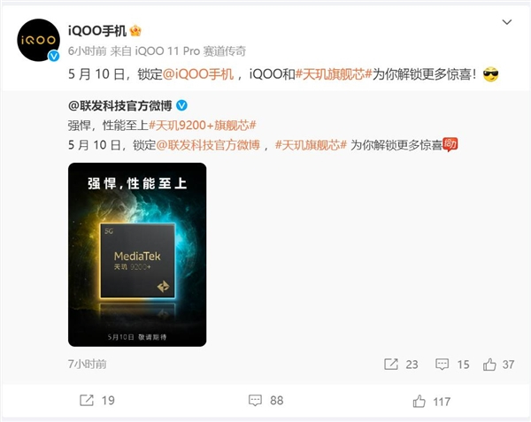 快科技5月5日消息,iQOO转发联发科天玑微博,预告天玑9200+将在5月10日发布,与此同时,iQOO将会在当天宣布重要消息。