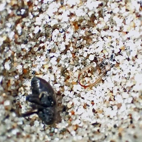 坑挖好后,蚁狮会将身体埋进坑底沙子里,只有两个大颚伸出来,然后静静等待猎物落入沙坑。
