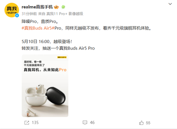 快科技5月5日消息,今天,realme真我官方宣布,除了真我11 Pro+外,还将在5月0日推出一款新的TWS无线耳机:真我Buds Air5 Pro。