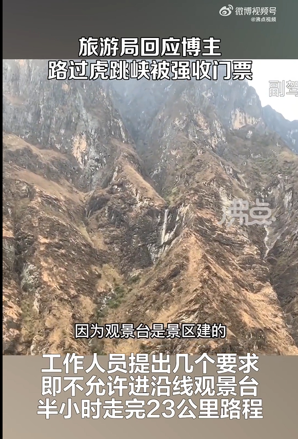 据媒体报道,近日一博主称开车路过虎跳峡景区被强买门票。其晒出的视频中,工作人员表示,如果不买门票,仅过路,则需要在半个小时内驶出23公里景区路段,沿途不允许拍照。该路段沿途有3个观景平台,不买票不能拍照不能进景区。该博主表示,此路段属于省道,而且沿途路况复杂,景区要求半小时走完,对不进景点的游客并不合理。