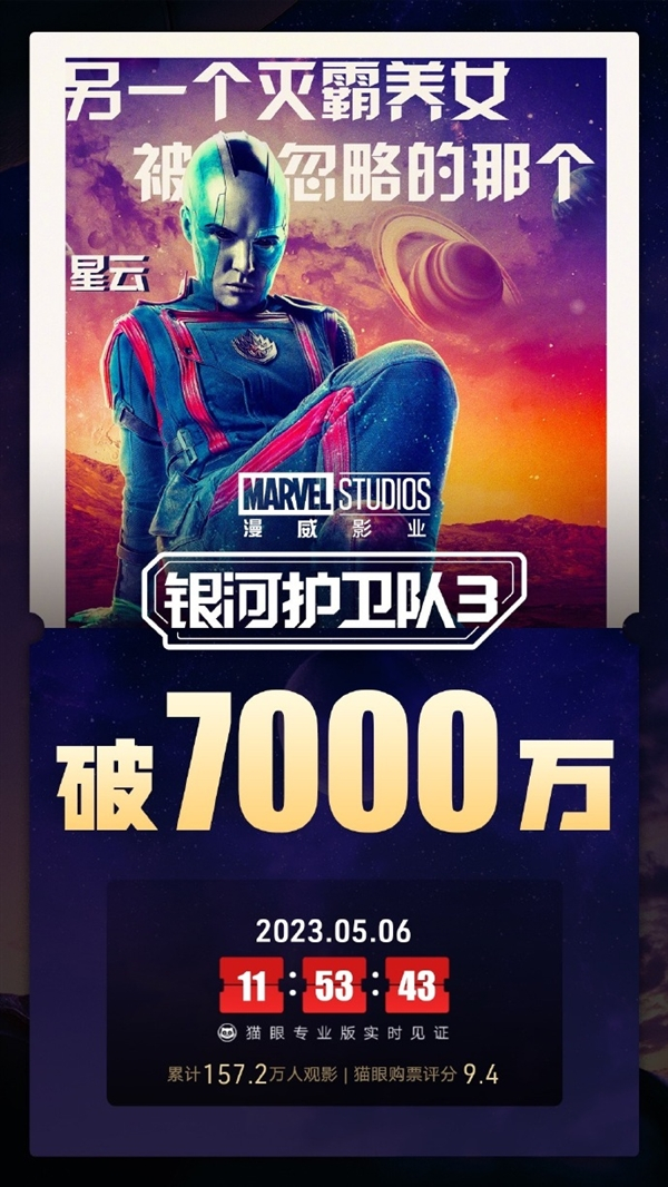 据猫眼专业版数据,电影《银河护卫队3》上映2天 ,总票房破7000万。口碑方面,本片豆瓣评分高达8.7分,位居整个漫威“宇宙”最高分。