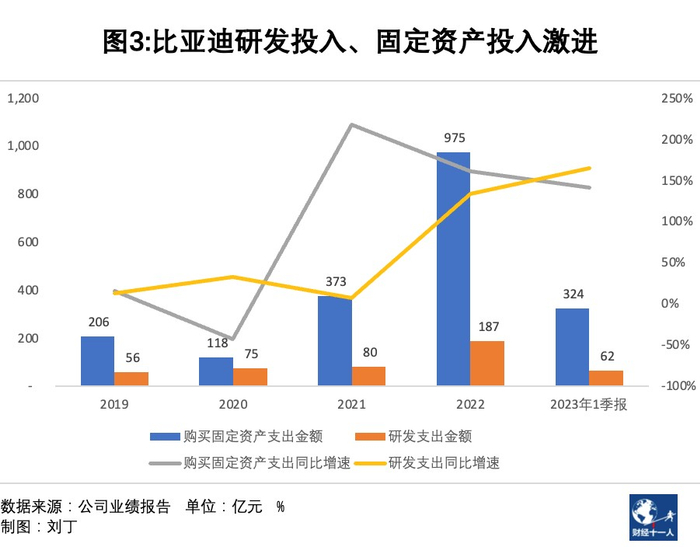 比亚迪的固定资产投资(购建固定资产、无形资产和其他长期资产支付的现金),从2019年到2021年的年均值为233亿元,2022年猛增到近1000亿元,2023年1季度的投入为323亿元,是上年同期的2.4倍。
