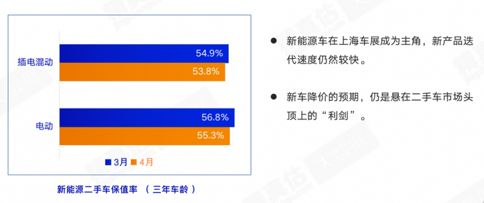但从4月份数据来看,插电混动和纯电动车型保值率相较于3月份出现了明显的下降。