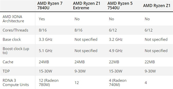 它们都有Zen4 CPU架构、RDNA3 GPU架构。其中,锐龙Z1、锐龙5 7540U都是6核心12线程、6MB二级缓存、16MB三级缓存、4个GPU单元。