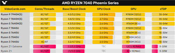 从公布的规格看,锐龙Z1、锐龙Z1 Extreme像极了刚刚正式发布的锐龙5 7540U、锐龙7 7840U。