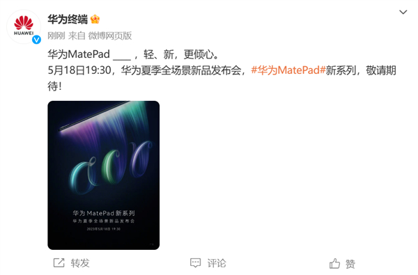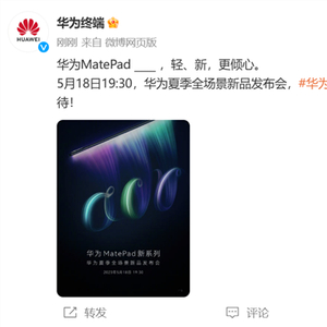 5月8日,华为终端官方微博发布预热海报,宣布华为新系列平板将于5月18日在华为夏季全场景新品发布会上正式发布。