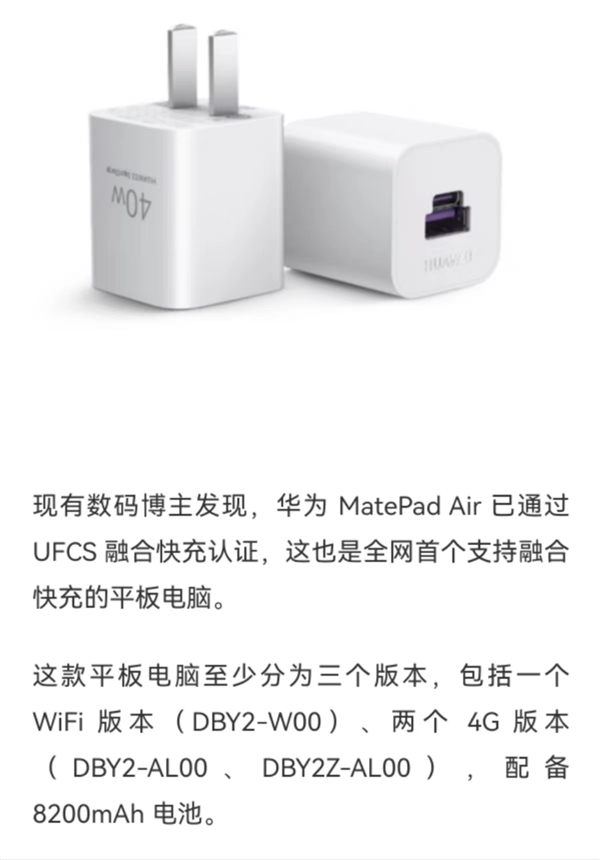 事实上,早先就有消息显示,华为MatePad Air已通过UFCS融合快充认证,这也是全网首个支持融合快充的平板电脑。这款平板电脑至少分为三个版本,包括一个WiFi版本(DBY2-W00)、两个4G版本(DBY2-AL00、DBY2Z-AL00),配备8200mAh电池,支持40W超级快充。大电池和快充组合可大大减少续航焦虑,势必会让华为MatePad Air在在差旅、会议等移动办公场景更加游刃有余,为用户带来轻松愉悦的使用体验。