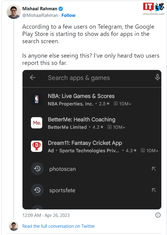 谷歌 Play Store 商店广告入侵“搜索栏历史”