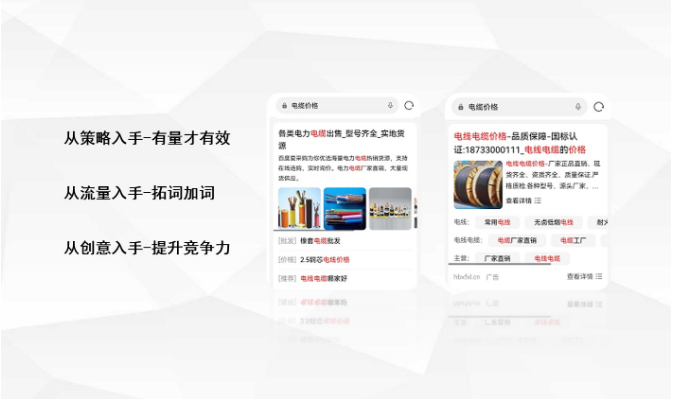 起帆电缆的产品拥有30多个系列、上万种规格,客户更是涵盖石油、化工、建筑等领域客户。服务对象不同,需求也各有特色。360搜索凤舞广告通过关键词匹配技术,定位目标客群,展现样式丰富新颖。凤舞橱窗、导航、文字子链、图片子链、电话直呼按钮……智能组件可以灵活拼接,针对起帆电缆的不同产品、不同行业客户实现差异化的营销展现。