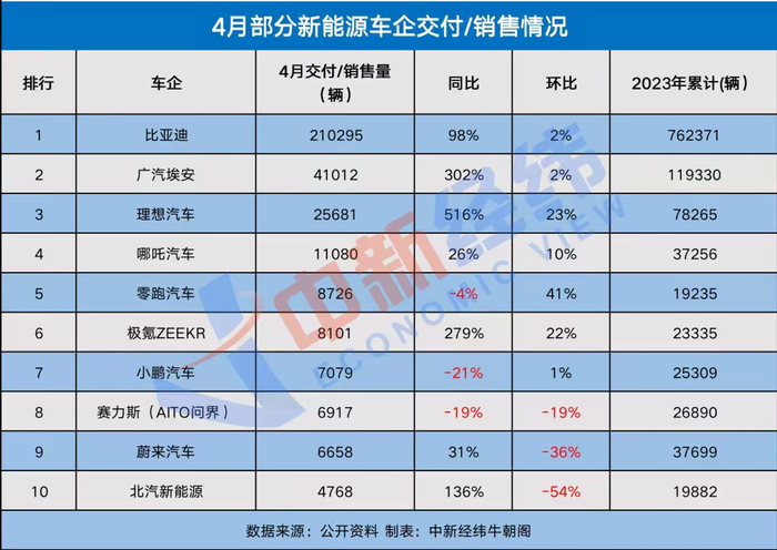 4月销冠由比亚迪蝉联,广汽埃安和理想汽车则位列销售亚军和季军。