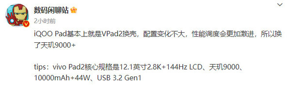 @数码闲聊站 爆料称,“iQOO Pad基本上就是vivo Pad2换壳,配置变化不大,性能调度会更加激进,所以换了天玑9000+。”
