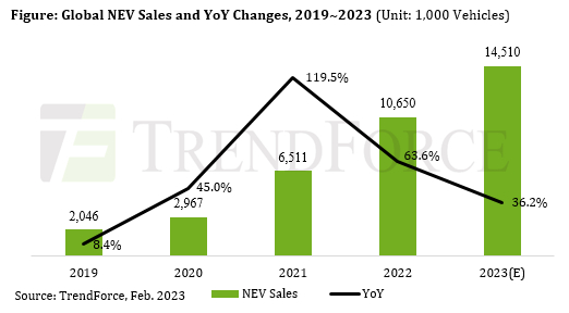 TrendForce:2022年全球新能源汽车销量1065万辆 同比增长63.6%