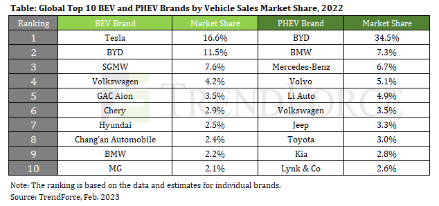 在 BEV 市场,特斯拉仍然是 2022 年汽车销量第一的品牌,但其市场份额下滑至 16.6%。相反,比亚迪将其纯电动汽车的市场份额提高到 11.5%,并将与特斯拉的差距缩小到仅 5 个百分点左右。比亚迪的增长主要归功于其广受欢迎的超小型电动掀背车 Dolphin。强调可负担性,该车型占比亚迪 2022 年 BEV 销量的 23%。从2022年销量前十的纯电动汽车品牌排名来看,第五名到第十名较前一年有所变化。奥拉、小鹏、雷诺退出前十,而老牌豪华汽车品牌宝马首次进入排行榜,其纯电动汽车销量翻番,位列第九。
