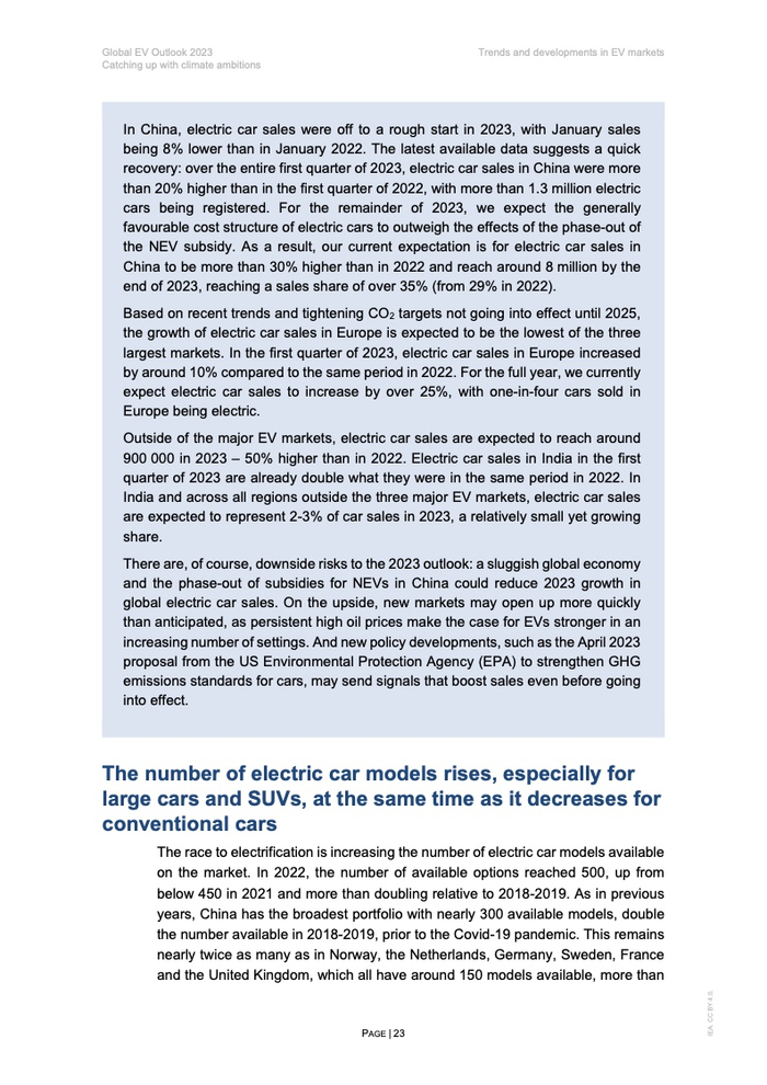 IEA认为,由于价格实惠的电动汽车越来越普及,尽管2023年中国电动汽车国家补贴已经退出,但预计销量仍将继续增长。IEA预计2023年中国电动汽车销量将比2022年高出30%以上,达到800万辆左右,销售渗透率超过35%。