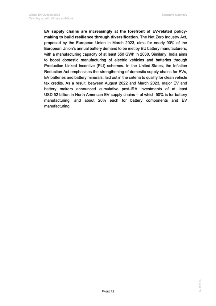 IEA还指出,电动汽车市场趋势正在对电池生产和供应链产生积极的连锁反应。全球已宣布的电池项目足以满足到2030年的电动汽车需求。不过电池和材料市场仍高度集中,2022年中国电池及材料出口占全球份额35%以上。