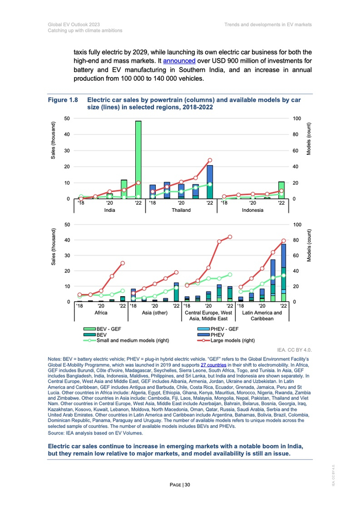 除了中国,2022年,欧洲、美国电动汽车销售量分别增长15%和55%,印度、印度尼西亚电动汽车销售量增加两倍以上,泰国销量翻倍。
