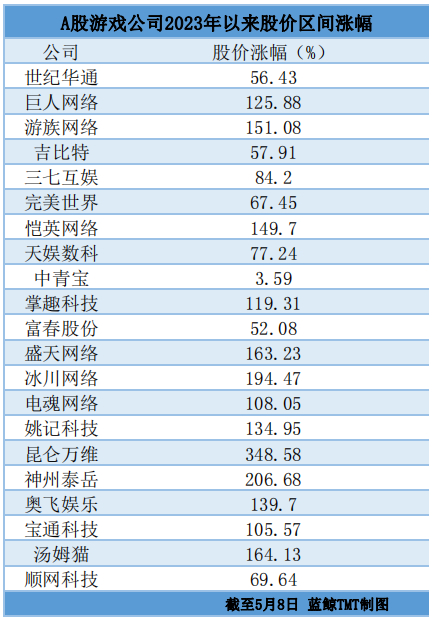 12只A股游戏股2023年以来涨幅超100%