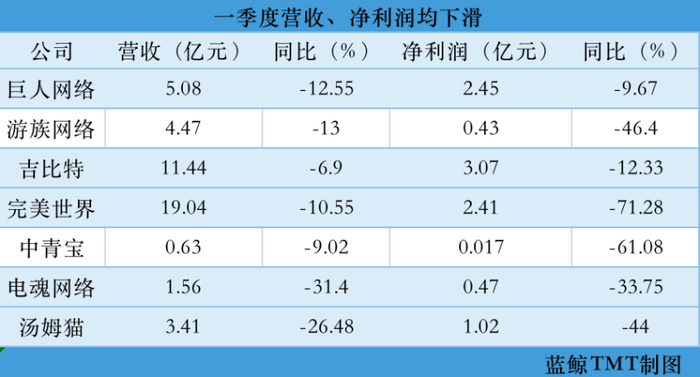 在记者统计的21家A股游戏公司中,有7家企业一季度营收、净利润均下滑,包括巨人网络、游族网络、完美世界、吉比特、中青宝、电魂网络以及汤姆猫。