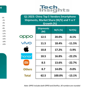C114讯 5月9日消息(颜翊)TechInsights的最新研究指出,2023年Q1中国智能手机出货量同比下降了13%。这是中国市场连续第五个季度出现两位数的下跌。