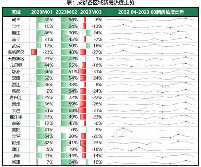 从区域来看,1月,一圈层的武侯、成化、锦江等区域,三圈层的简阳、金堂区热度增长较快,到2月,除高新西区、天府新区、双流、崇州二手房热度增速提高外,其他区域热度增速均有所下降,到3月除简阳外,其他区域热度均快速回升。其中高新西区3月热度环比增长率达到近一年以来最高。