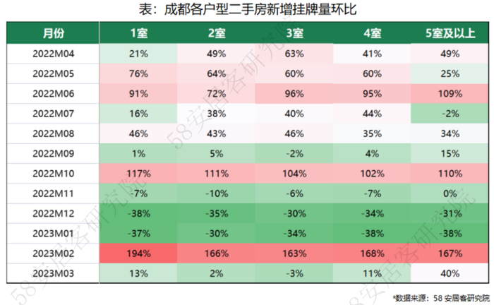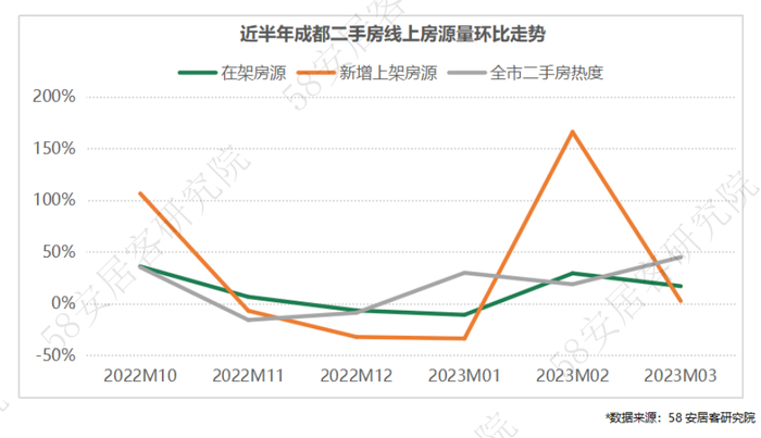由于房贷利率的降低、二手房带押过户的推行,叠加新房供应量的增加,不少前期利率高点买房的房东为置换利率选择出售房子。2月成都新增上架房源环比增长超过160%,达到半年来的最大值,于此同时城市在架房源量的涨幅也达到高点,3月随着二手房成交规模的上涨,未挂牌存量房源的减少,全市新增上架房源量和总在架房源量都显著回落。