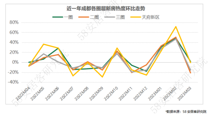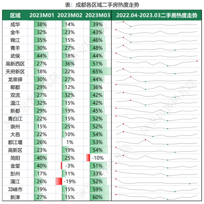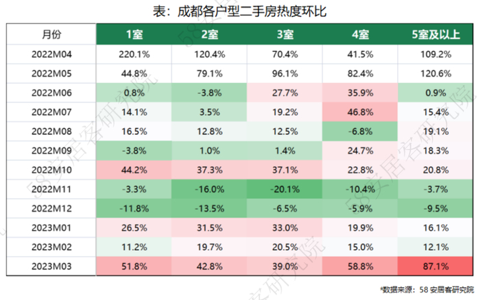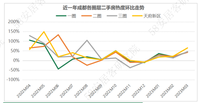 从市场热度来看,进入2023年,成都二手房市场热度即开始上升,一季度3个月环比连续上涨,平均涨幅超过30%。从短期来看,市场上买学区房的需求、从外围向核心区和改善的置换需求仍然存在,后续热度有望延续。