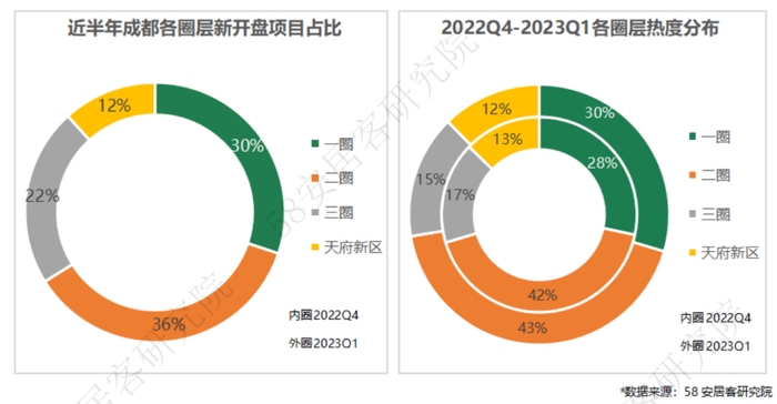 近半年来,成都新开盘项目中,一圈层占比约30%,二圈层占比约36%,三圈层占比约22%,天府新区单独占比达到12%。对比各圈层覆盖范围,可以看到核心的一圈层和天府新区新盘供应占比相对较高,外围圈层项目占比较少。