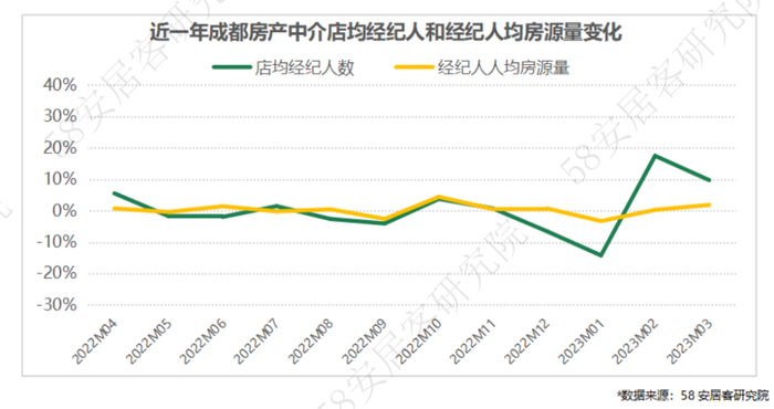 受益于房地产市场的热度,入市客户的增多,2、3月成都房产中介单店经纪人数量大增。相对应的是单个经纪人挂牌房源量基本保持稳定,从业人员间的竞争态势不变。