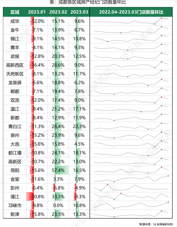 成都23个区域中,除彭州、蒲江外,有19个区的房产中介门店2月份环比增长达到近一年来的最大值,金堂和邛崃在3月份环比增长达到最大值。其中,一圈层的武侯和高新西区、二圈层的青白江、三圈层的简阳涨幅最大。