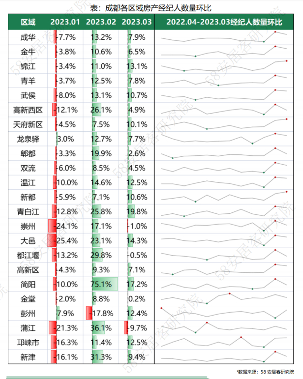 整体来看,一、二圈层13个区域房产经纪人2、3月份均保持上涨,其中,高新西区和青白江涨幅最大。锦江区、天府新区和新都区3月份较2月份涨幅上扬,其他区域均有所回落。三圈层各区之间存在差异,大邑、简阳、邛崃连续两月经纪人涨幅超过10%;崇州、都江堰、彭州和蒲江则出现经纪人减少的月份。各区域经纪人变化的不同也反映了其楼市表现的差异。