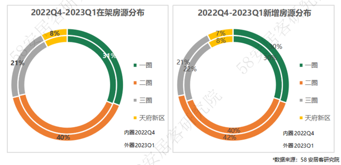 结合新房市场来看,由于一圈层区域一定量的新增供应,不少人选择出售二三圈层的房屋进入核心区购房,比如郫都、双流、新都等二圈层客群去往成化、武侯等核心区域购房,也有二三圈层本身置换房屋的需求,使得这些圈层新增挂牌量占比提升。