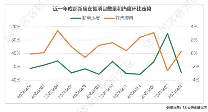 从2022年9月起到2023年1月,成都新房在售数量保持增长,2月可见看房热度增长近100%,市场热度和成交量的上升使得2月在售数量下降,到3月在售项目数量复又增加,同时可见热度环比略降,但对比前期仍保持了相对较高的热度。