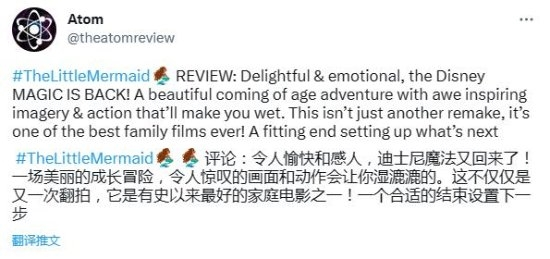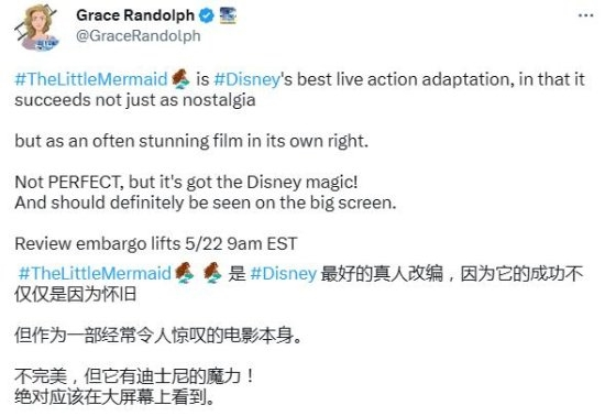 迪士尼真人版《小美人鱼》在全球首映之后先期口碑解禁,本片获得了所有影评人的一致称赞,绝大多数人都表示这是迪士尼最佳真人改编电影。