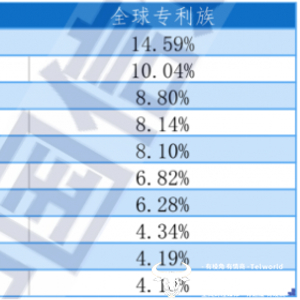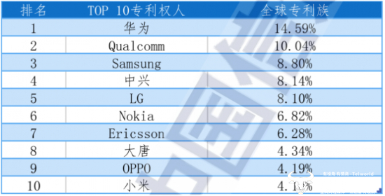从有效全球专利族的占比来看,华为的有效全球专利族数量占比为14.59%,排名第一位;高通排在第二位,其占比为10.04%;三星排在第三位,其占比为8.80%。排名第四位至第十位的企业依次是中兴、LG、诺基亚、爱立信、大唐、OPPO和小米。