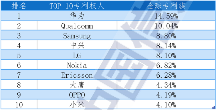 从有效全球专利族的占比来看,华为的有效全球专利族数量占比为14.59%,排名第一位;高通排在第二位,其占比为10.04%;三星排在第三位,其占比为8.80%。排名第四位至第十位的企业依次是中兴、LG、诺基亚、爱立信、大唐、OPPO和小米。