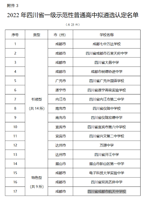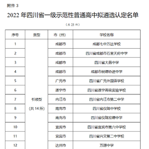 公示的名单里,2022年四川省一级示范性普通高中拟遴选认定名单全省共23所。