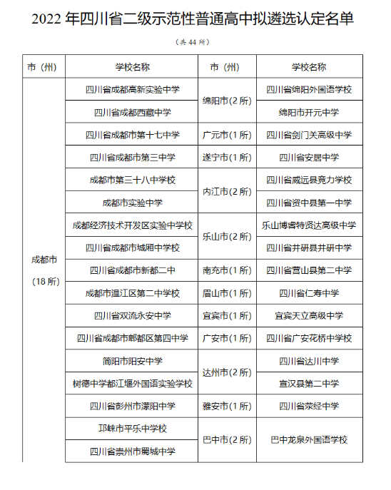 此外,2022年四川省二级示范性普通高中拟遴选认定名单共有44所,成都有18所上榜。