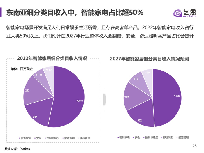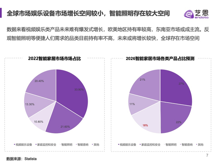 数据来看视频娱乐类产品未来难有爆发式增长,欧美地区持有率较高,东南亚市场或成主流。反观智能照明等便捷人们需求的品类目前持有率不高,未来或将增长较快,全球存在市场空间。