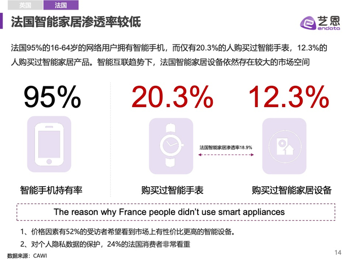 法国95%16-64岁的网络用户拥有智能手机,而仅有20.3%的人购买过智能手表,12.3%的人购买过智能家居产品。智能互联趋势下,法国智能家居设备依然存在较大的市场空间。