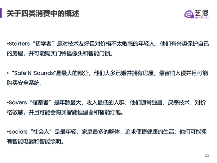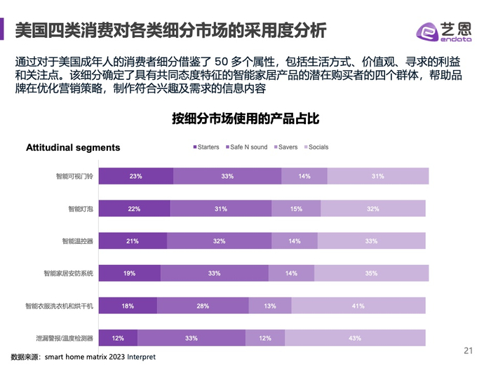 通过对于美国成年人的消费者细分借鉴了 50 多个属性,包括生活方式、价值观、寻求的利益和关注点。该细分确定了具有共同态度特征的智能家居产品的潜在购买者的四个群体,帮助品牌在优化营销策略,制作符合兴趣及需求的信息内容。