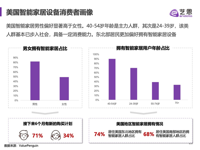 美国智能家居男性偏好显著高于女性。40-54岁年龄是主力人群,其次是24-39岁,该类人群基本已步入社会,具备一定消费能力。东北部居民更加偏好拥有智能家居设备。