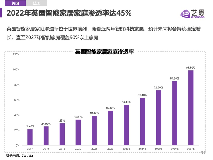 英国智能家居家庭渗透率位于世界前列,随着近两年智能科技发展,预计未来将会持续稳定增长,直至2027年智能家庭覆盖90%以上家庭