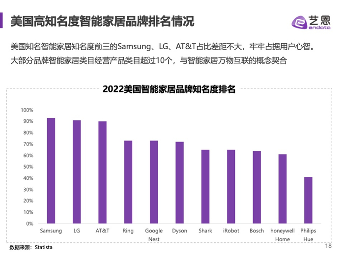 美国知名智能家居知名度前三的SamsungLGAT&T占比差距不大,牢牢占据用户心智。