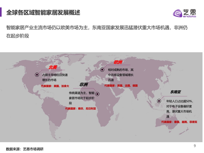 智能家居产业主流市场仍以欧美市场为主,东南亚国家发展迅猛潜伏重大市场机遇,非洲仍在起步阶段