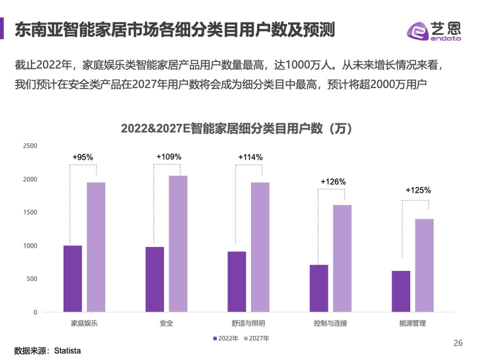 截止2022年,家庭娱乐类智能家居产品用户数量最高,达1000万人。从未来增长情况来看,我们预计在安全类产品在2027年用户数将会成为细分类目中最高,预计将超2000万用户。