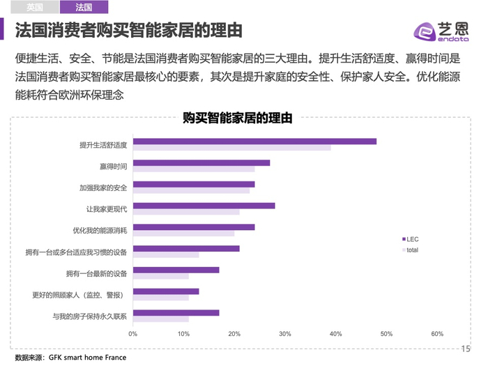 便捷生活、安全、节能是法国消费者购买智能家居的三大理由。提升生活舒适度、赢得时间是法国消费者购买智能家居最核心的要素,其次是提升家庭的安全性、保护家人安全。优化能源能耗符合欧洲环保理念。