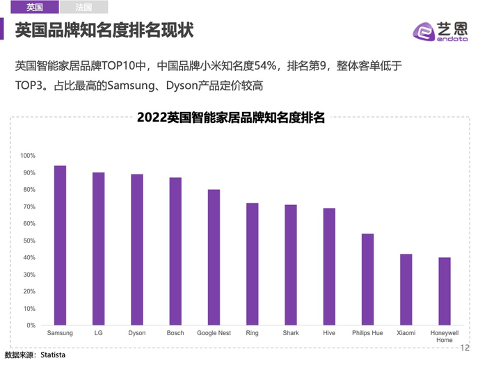 英国智能家居品牌TOP10中,中国品牌小米知名度54%,排名第9,整体客单低于TOP3。占比最高的SamsungDyson产品定价较高。