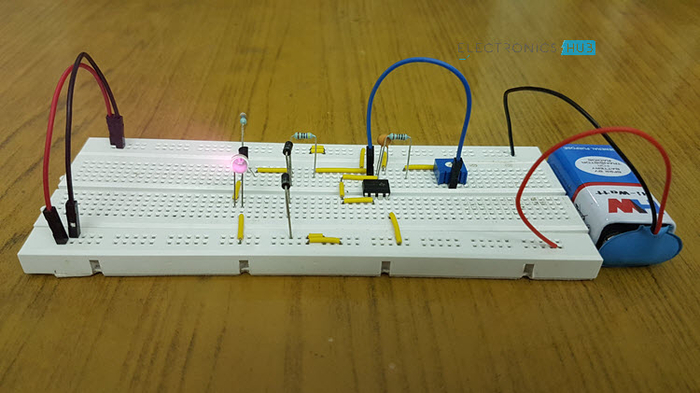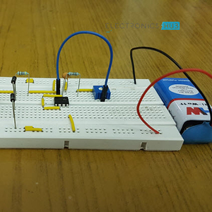 该电路被设计为产生38KHz的信号。这个电路的主要部件是555定时器。在这里,它是以星形多谐振荡器模式运行的。在这个电路中,第2和第6个引脚被短路,以便在每个定时周期后进行触发,这两个引脚通过电容接地。555定时器的第4个引脚连接到电源,以避免突然复位。