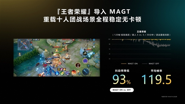 另外,在天玑9200+MAGT技术的加持下,《王者荣耀》在120帧、极致画质下,真人5V5 30分钟团战重载场景下,抖动率降低93%,平均帧率达到119.5,几乎满帧的游戏体验可帮助玩家流畅战胜每次团战。